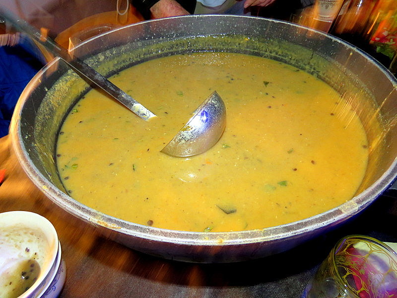 Еда подается официантами поющими, танцующими, играющими на музыкальных инструментах, одетых в красочные одеяния.